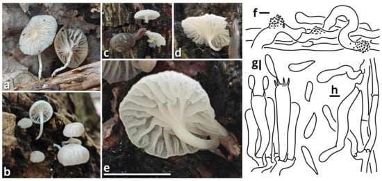 - Vizzini, A.; Consiglio, G.; Marchetti, M.; Borovička, J.; Campo, E.; Cooper, J.; Lebeuf, R.; Ševčíková, H. New data in Porotheleaceae and Cyphellaceae: Epitypification of Prunulus scabripes Murrill, the status of Mycopan Redhead, Moncalvo & Vilgalys and a new combination in Pleurella Horak emend. Mycol. Prog. 2022, 21, 44. [Google Scholar] [CrossRef]