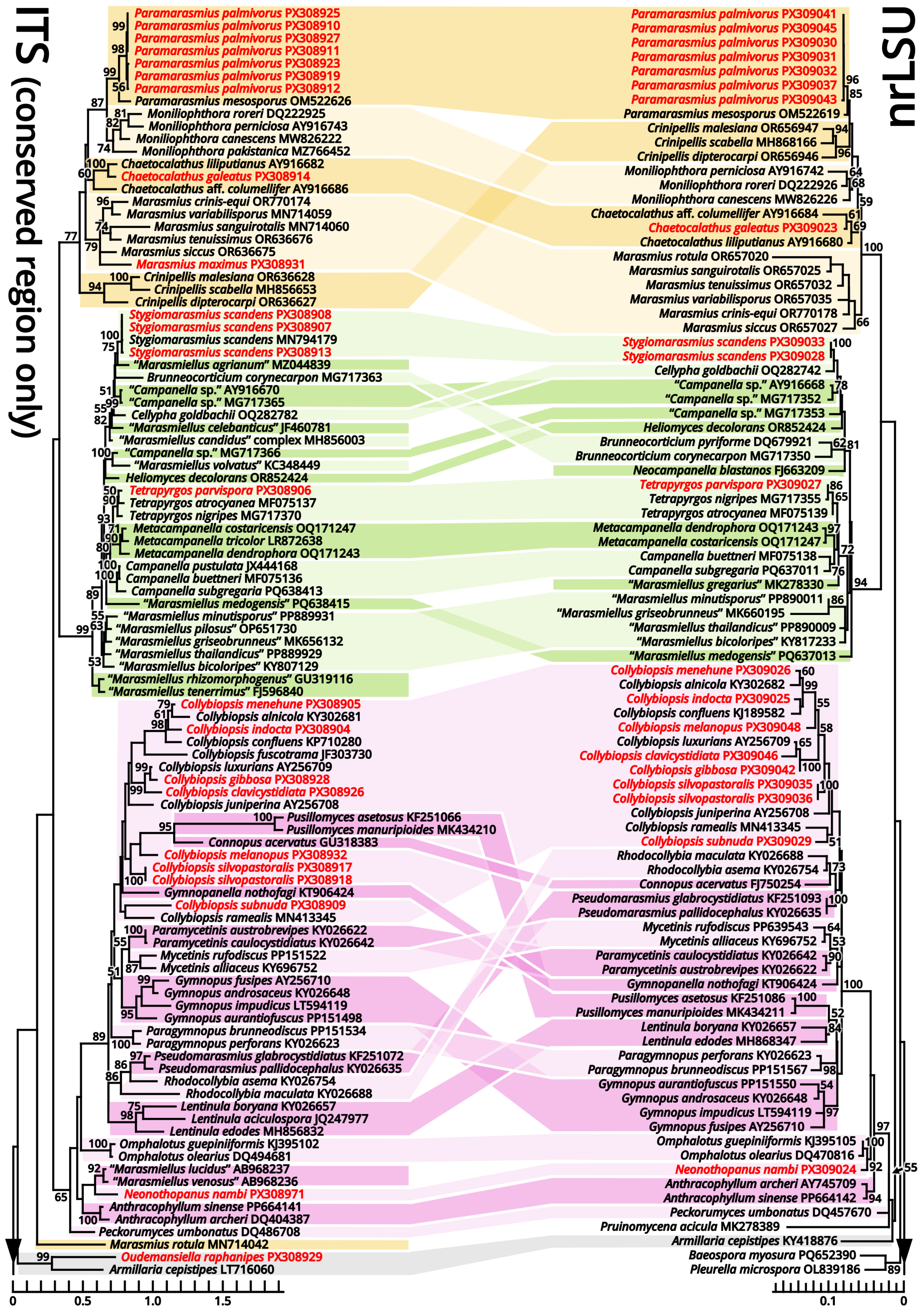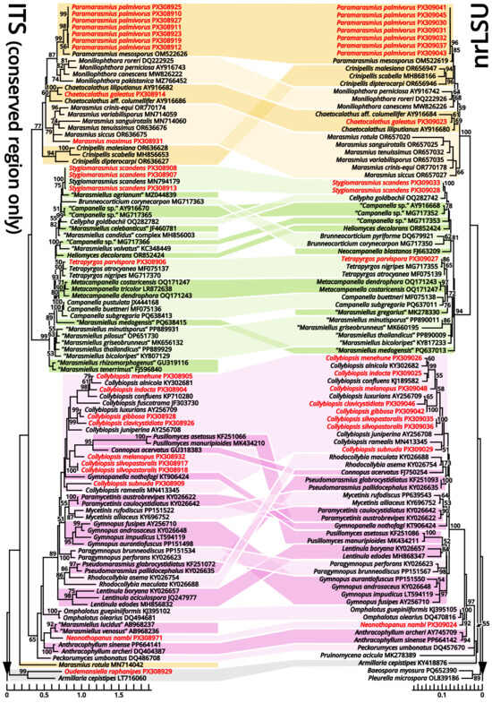 - Oliveira, J.J.S.; Desjardin, D.E.; Jenkinson, T.S.; Margaritescu, S.; Capelari, M.; Moncalvo, J.-M. Taxonomic revision of Marasmius Fr. and Marasmiaceae Roze ex Kühner based on multigene phylogenetics and morphological evidence. Fungal Divers. 2024, 127, 1–54. [Google Scholar] [CrossRef]