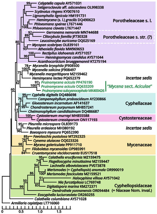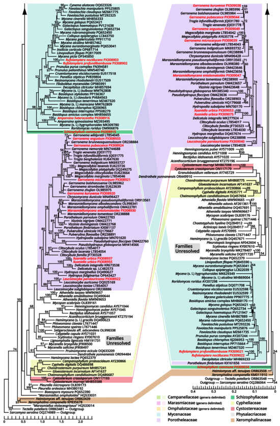 - Vizzini, A.; Alvarado, P.; Consiglio, G.; Marchetti, M.; Xu, J. Family matters inside the order Agaricales: Systematic reorganization and classification of incertae sedis clitocyboid, pleurotoid and tricholomatoid taxa based on an updated 6-gene phylogeny. Stud. Mycol. 2024, 107, 67–148. [Google Scholar] [CrossRef] [PubMed]