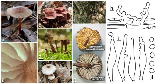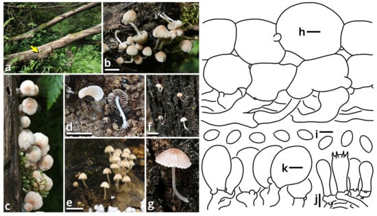 - Yang, K.L.; Lin, J.Y.; Li, G.-M.; Yang, Z.L. Introducing one new genus and two new species of Psathyrellaceae (Basidiomycota, Agaricales), with notes on Candolleomyces and Ephemerocybe. Phytotaxa 2025, 702, 1–28. [Google Scholar] [CrossRef]