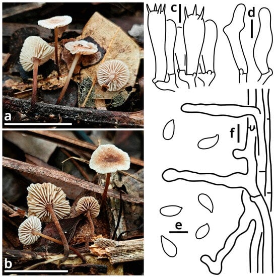 - Wei, R.; Ge, Y.; Qi, L.; Han, M.; Zeng, H.; Hu, Y.; Zou, L.; Cheng, X.; Wu, X.; Na, Q. Revealing brownish Mycena diversity in China: New discoveries and taxonomic insights. J. Fungi 2024, 10, 439. [Google Scholar] [CrossRef]