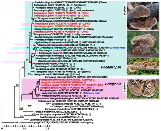 - Cui, B.K.; Li, H.-J.; Ji, X.; Zhou, J.-L.; Song, J.; Si, J.; Yang, Z.L.; Dai, Y.C. Species diversity, taxonomy and phylogeny of Polyporaceae (Basidiomycota) in China. Fungal Divers. 2019, 97, 137–392. [Google Scholar] [CrossRef]