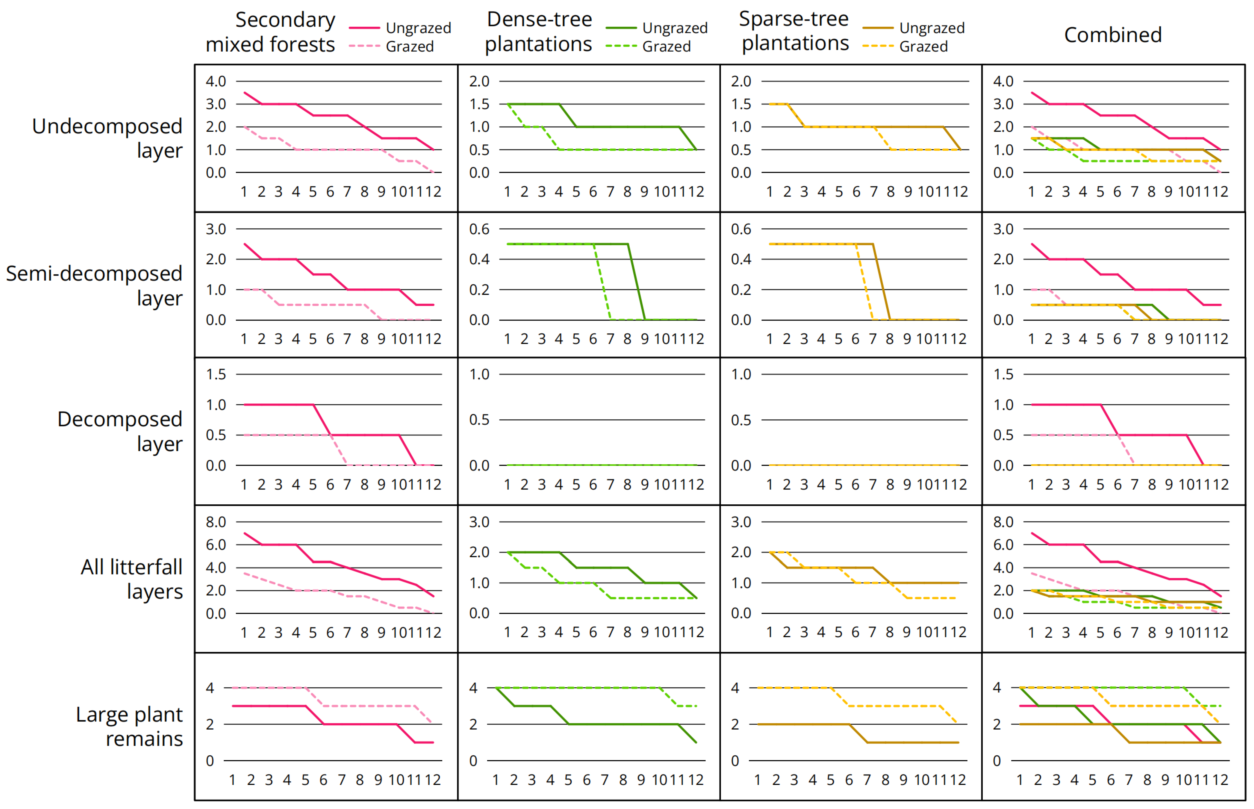 Sparse-tree plantations | Undecomposed layer | 1.00 | 1.00 | 52.0 | 0.203 | −0.278 | ↓ + |