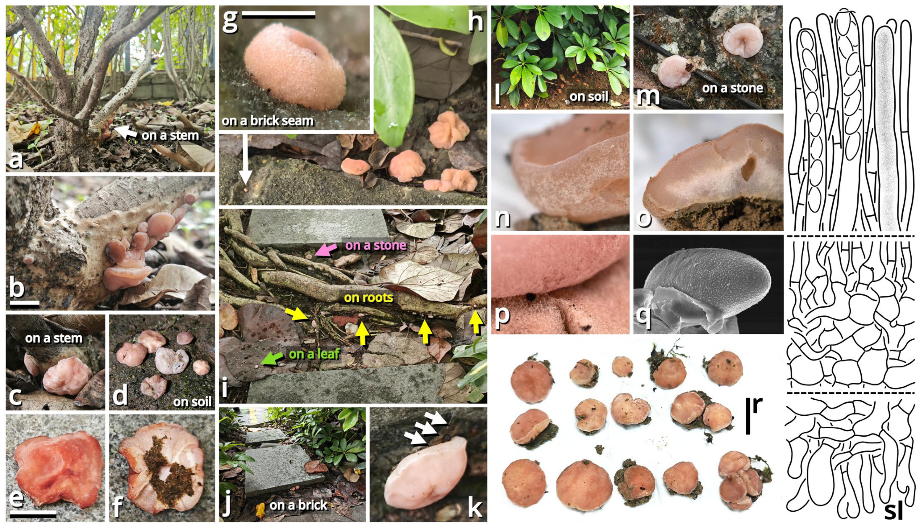 - Pfister, D.H. A redescription of Peziza bananicola and comments on some similar tropical species. Mycotaxon 1991, 41, 505–507. [Google Scholar]