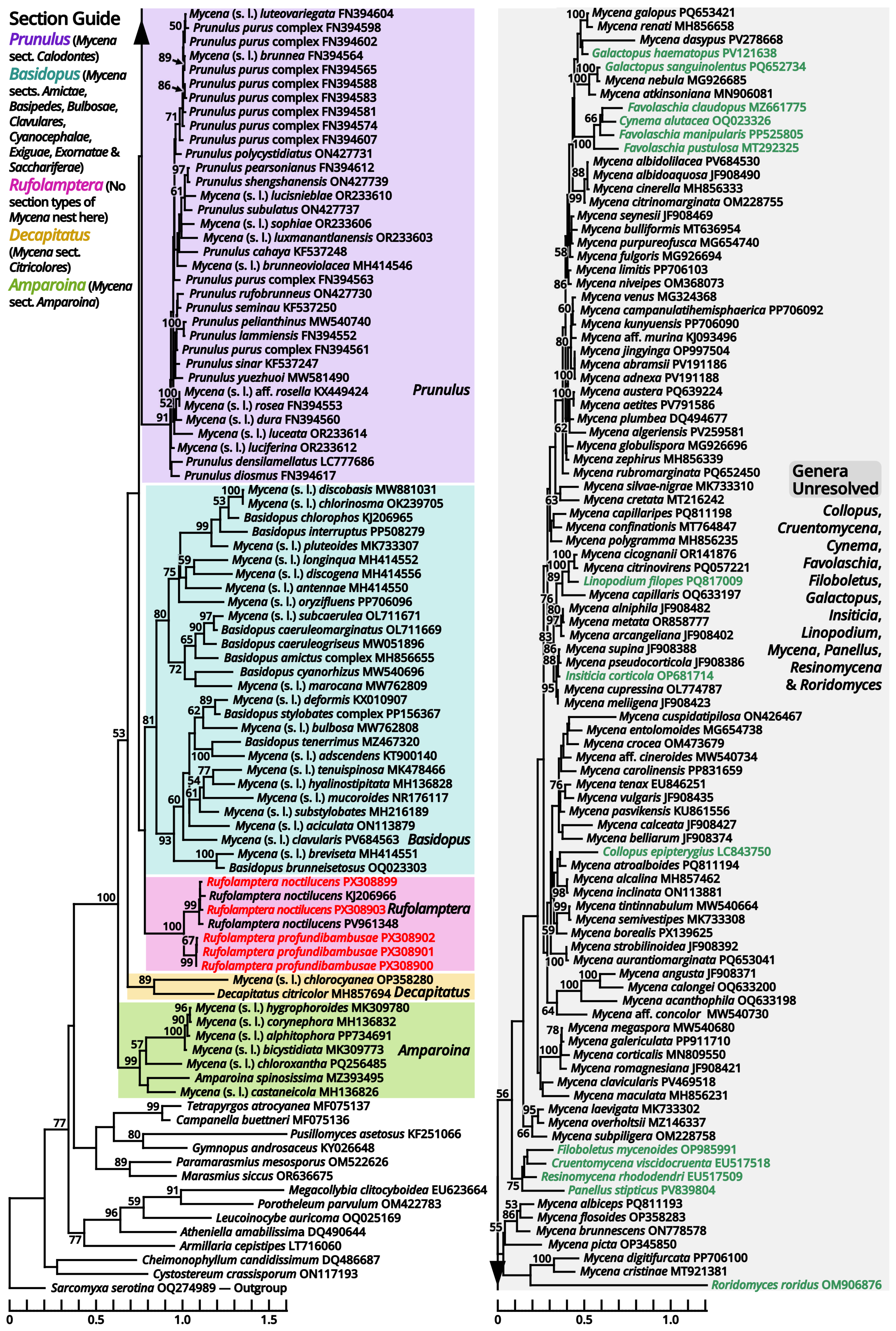 Mycenopsis Velen. (1947) | Mycenopsis globispora Velen. (1947) | Type species unsequenced. Similar species with clear concept unrecognized. | Amparoina Singer (1958) Cruentomycena R.H. Petersen, Kovalenko & O.V. Morozova (2008) Cynema Maas Geest. & E. Horak (1995) Decapitatus Redhead & Seifert (2000) Resinomycena Redhead & Singer (1981) Roridomyces Rexer (1994) Rufolamptera (this study) |