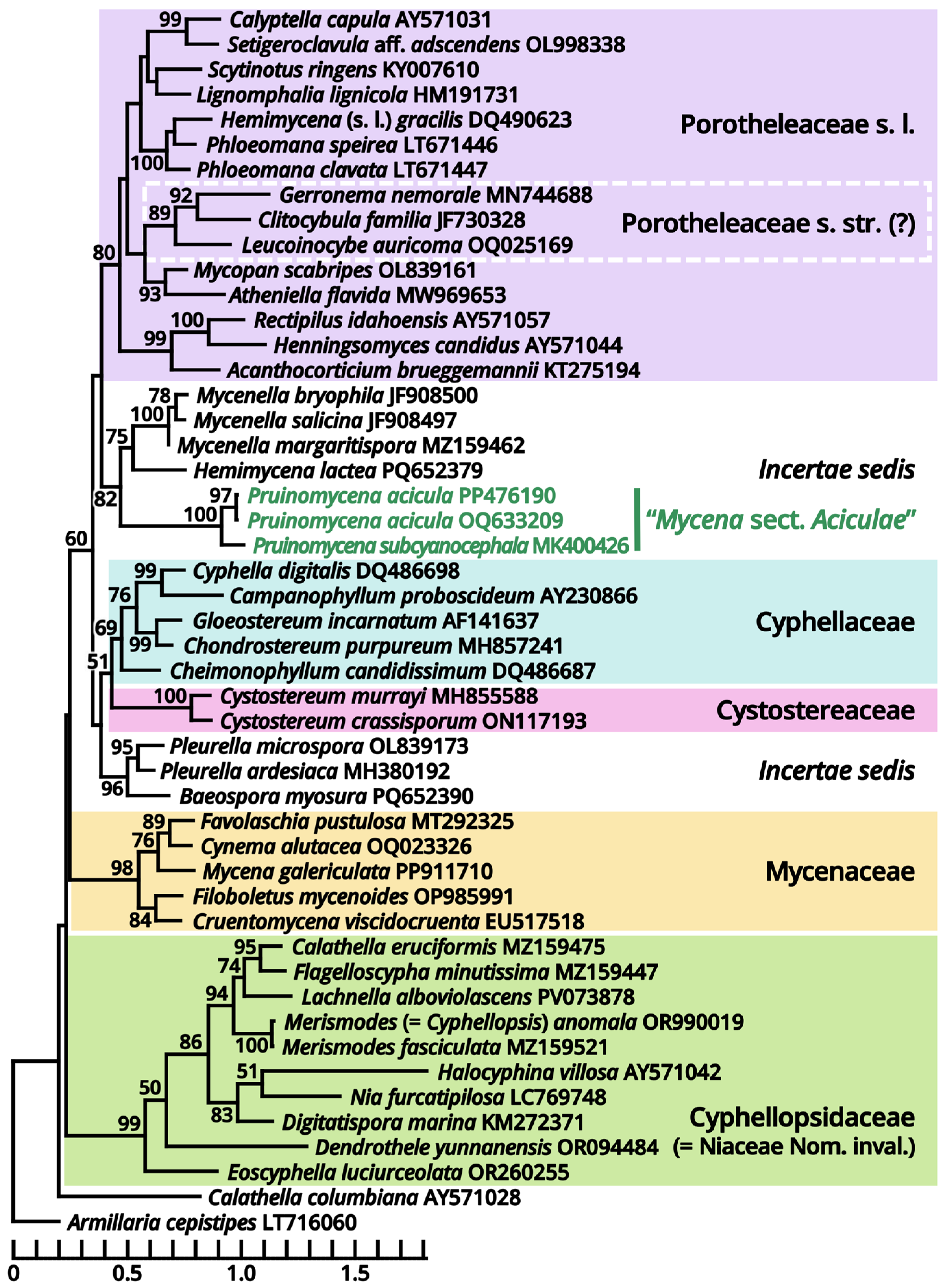 Eomycenella G.F. Atk. (1902) | Eomycenella echinocephala G.F. Atk. (1902) | Type species unsequenced, similar to Amparoina Singer (1958) and Basidopus Earle (1909). | Amparoina Singer (1958) Basidopus Earle (1909) Collopus Earle (1909) Cruentomycena R.H. Petersen, Kovalenko & O.V. Morozova (2008) Cynema Maas Geest. & E. Horak (1995) Decapitatus Redhead & Seifert (2000) Galactopus Earle (1909) Insiticia Earle (1909) Linopodium Earle (1909) Resinomycena Redhead & Singer (1981) Roridomyces Rexer (1994) Rufolamptera (this study) |