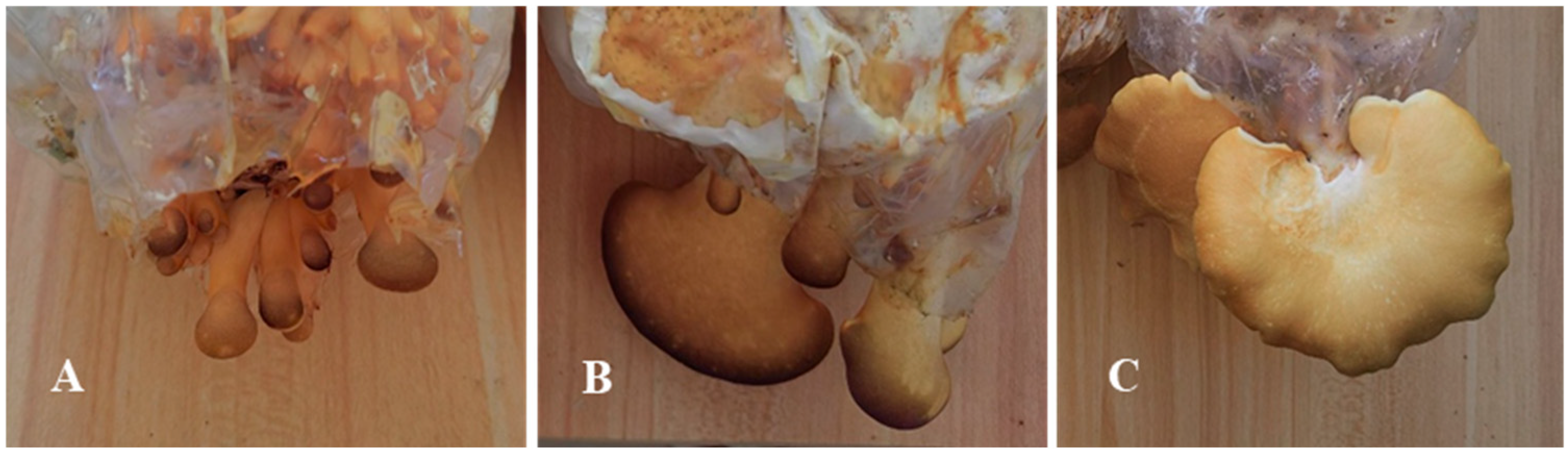 - Jiang, W.Z.; Miao, L.; Wang, P. Biological characteristics and domestication cultivation analysis of wild Sarcomyxa edulis strain. J. Jilin Agric. Sci. Technol. Univ. 2024, 33, 1–8. [Google Scholar]
