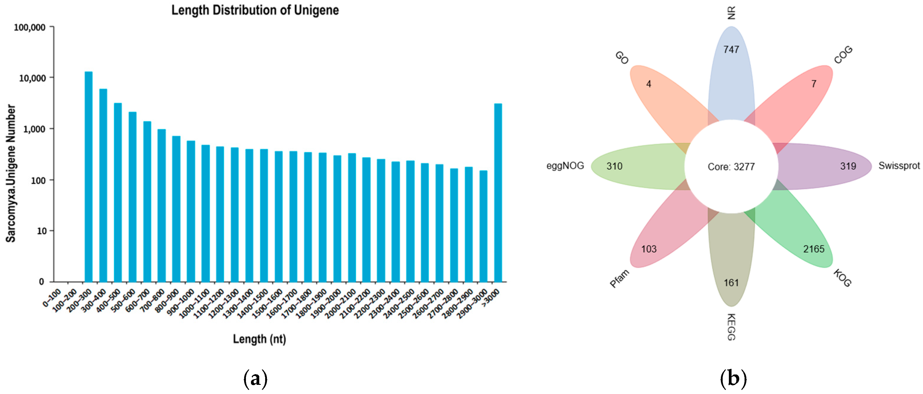 - Grabherr, M.G.; Haas, B.J.; Yassour, M.; Levin, J.Z.; Thompson, D.A.; Amit, I.; Adiconis, X.; Fan, L.; Raychowdhury, R.; Zeng, Q.D.; et al. Full-length transcriptome assembly from RNA Seq data without a reference genome. Nat. Biotechnol. 2011, 29, 644–652. [Google Scholar] [CrossRef]