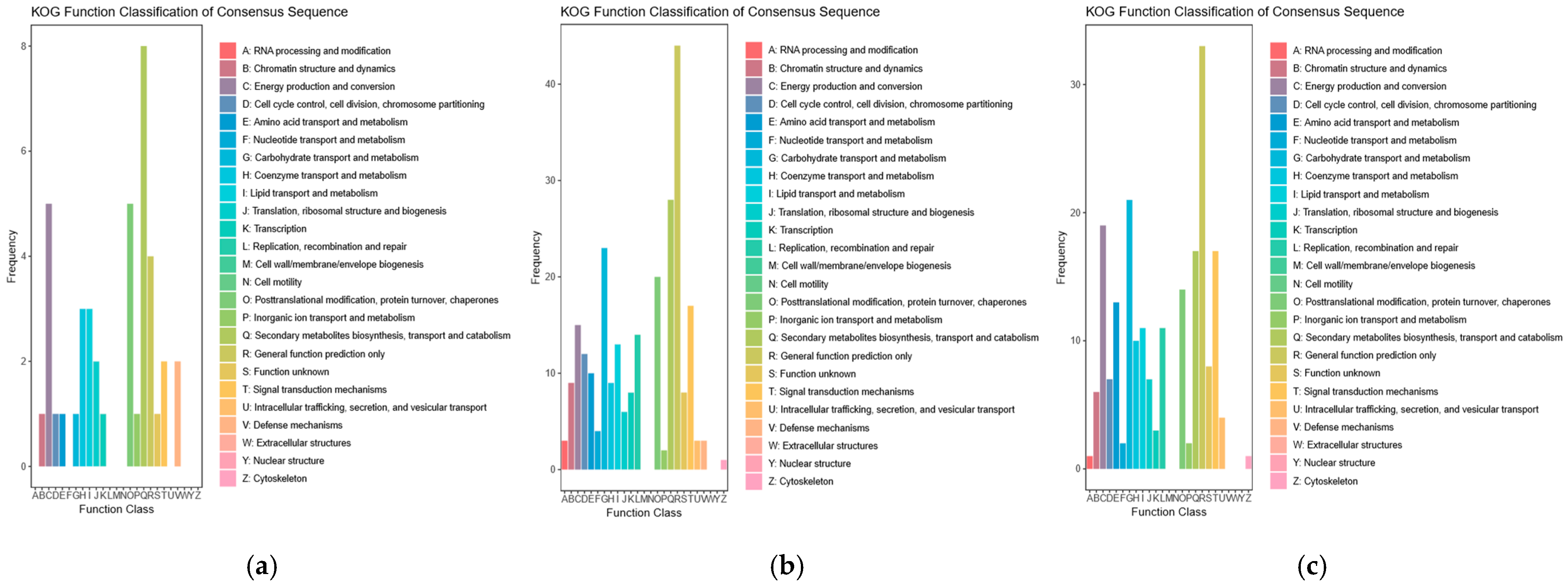 - Tatusov, R.L.; Galperin, M.Y.; Natale, D.A. The COG database: A tool for genome scale analysis of protein functions and evolution. Nucleic Acids Res. 2000, 28, 33–36. [Google Scholar] [CrossRef]