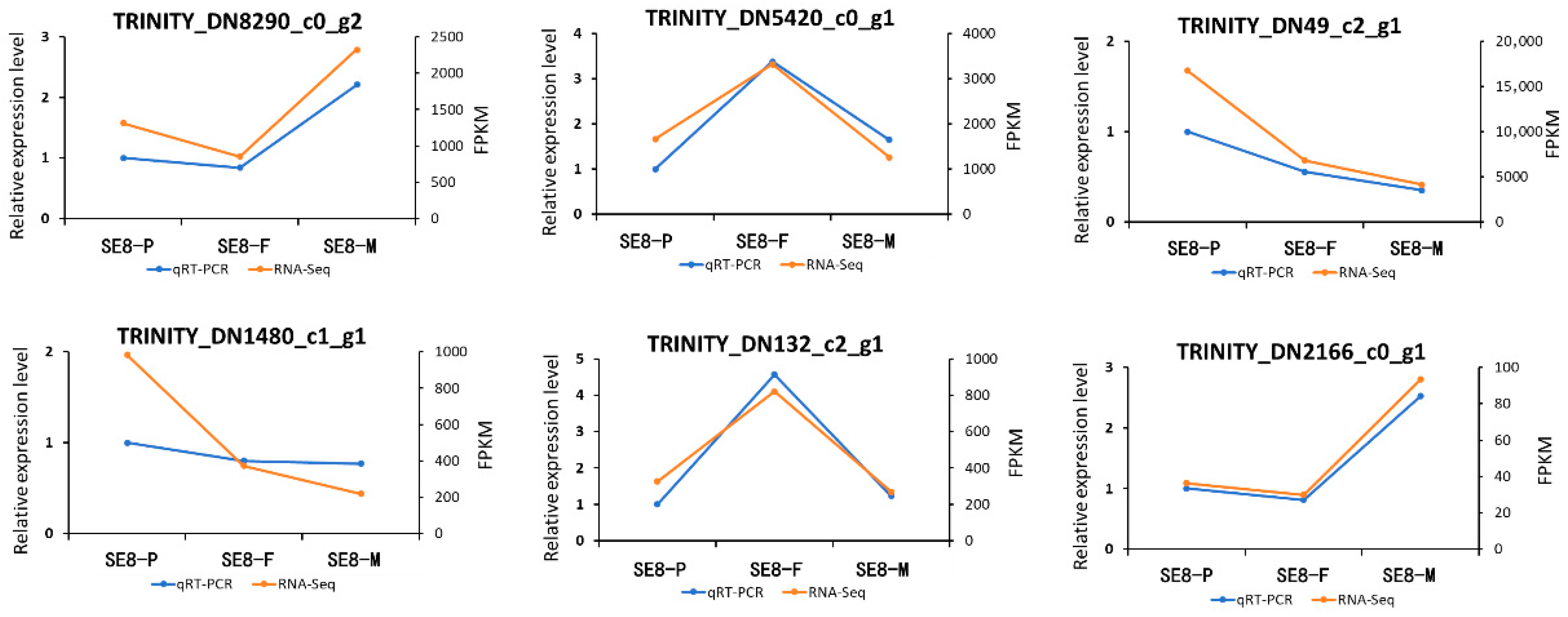 3.8. qRT–PCR Validation of DEGs at Different Growth and Development Stages