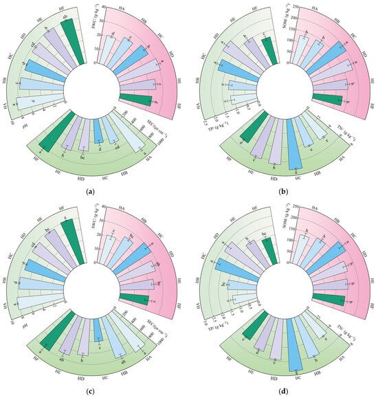Changes in soil physical and chemical properties under different mixed-sowing treatments. Note: (a) index measured after 22 years of planting: pH, SWC, and SEC; (b) index measured after 22 years of planting: TP, SOM, and TN; (c) index measured after 22 years of planting: pH, SWC, and SEC; (d) index measured after 22 years of planting: TP, SOM, and TN. Different lowercase letters in the same treatment group showed significant differences at the level of p < 0.05.
