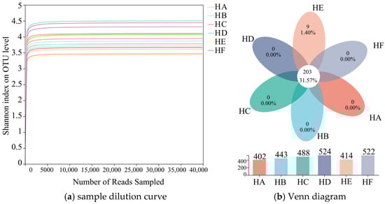 When the number of reads sampled reached 5000, the Shannon index dilution curve at the OTU level reached saturation and stabilized, indicating that the sequencing depth had adequately covered the fungal community in the samples and that the sequencing data were reliable (Figure 3a). Venn analysis revealed that a total of 643 OTUs were detected across the six Poaceae mixture sowing treatments (Figure 3b). Among these, the HD treatment exhibited the highest number of OTUs (524), while the HA and HE treatments showed the lowest, with 404 and 414 OTUs, respectively. The six treatments shared 203 common OTUs, accounting for 31.57% of the total OTUs. Unique OTUs were predominantly enriched in the HE treatment, with nine unique OTUs, representing 1.40% of the total.