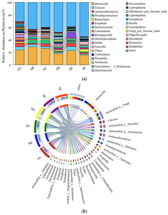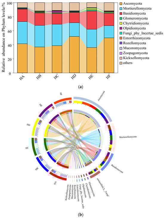 Changes in relative abundance of fungi in soil samples at the level of phylum. Note: (a) Circos, (b) CommunityBarPie.