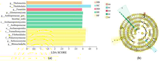 LEfSe analysis of fungal community in soil samples. Note: (a) LEfSe analysis (LDA > 4.0), (b) LDA value of indicator species (LDA > 4.0).