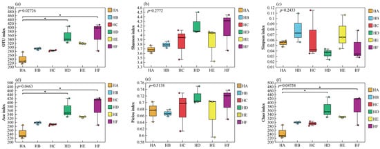 Difference in α diversity of fungal communities in soil samples. Note: (a) number of OTU, (b) Shannon index, (c) Simpson index, (d) Ace index, (e) Pielou index, (f) Chao1 index. * represents p < 0.05.