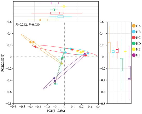 The β-diversity analysis (PCoA) of soil fungal communities based on Bray–Curtis distance revealed significant differences in β-diversity among different treatments (p = 0.03) (Figure 8). The HE treatment exhibited the highest within-group homogeneity, with sample points showing tightly clustered characteristics, while the HA, HC, and HF treatments demonstrated lower within-group homogeneity. The first two principal coordinate axes (PC1 and PC2) cumulatively explained 42.07% of the variance in sample composition, with PC1 accounting for 21.22% and PC2 for 20.85%.