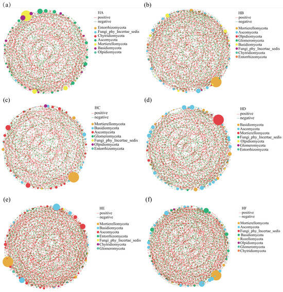 Single-factor molecular network diagram of fungal community in soil samples. Note: node color and size indicate species type and importance; line color indicates positive or negative correlation; and red positive, green negative, and the number of lines indicate whether the species are closely related. (a) HA, (b) HB, (c) HC, (d) HD, (e) HE, (f) HF.