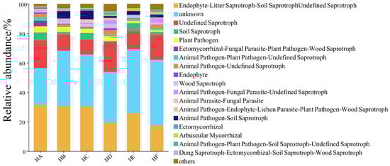 Based on the FUNGuild functional prediction, a total of 18 fungal trophic modes were identified across the six mixed-sowing treatments of Poaceae forage grass (Figure 10). The top five trophic modes in terms of functional abundance proportion were as follows: Endophyte-Litter Saprotroph-Soil Saprotroph-Undefined Saprotroph (17.41–31.48%), Unknown (25.00–44.65%), Undefined Saprotroph (9.90–20.22%), Soil Saprotroph (0.78–5.64%), and Plant Pathogen (1.04–4.13%). Specifically, the HA treatment was dominated by the Endophyte-Litter Saprotroph-Soil Saprotroph-Undefined Saprotroph, while the HB, HC, HD, HE, and HF treatments were primarily dominated by the Unknown functional group. The abundance of the unknown functional group in the HA treatment was significantly lower than that in the other treatments. Additionally, the HF treatment exhibited a significantly lower abundance of plant pathogen.