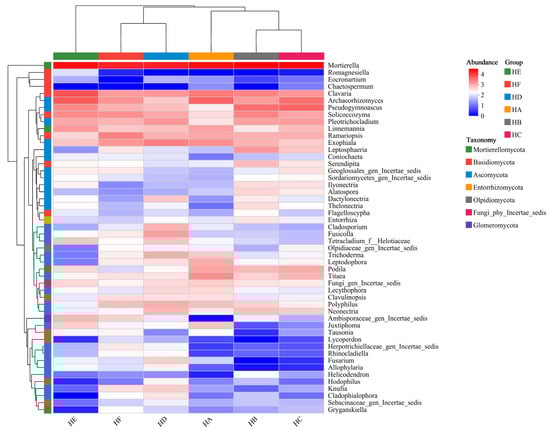 Phylogenetic heatmap analysis and cluster analysis based on the genus-level fungal community structure revealed that the six mixed-sowing treatments of Poaceae forage grass exerted significant regulatory effects on soil fungal composition, with the top 50 dominant fungal genera by relative abundance exhibiting significant specificity across different treatments (Figure 11). The HA treatment specifically clustered Mortierella, Clavaria, Archaeorhizomyces, and Titaea. The HB treatment was dominated by Mortierella, Pseudogymnoascus, and Solicoccozyma. The HC treatment showed significant enrichment of Mortierella, Archaeorhizomyces, and Pseudogymnoascus. The HD treatment was characterized by the enrichment of Mortierella, Exophiala, Pleotrichocladium, and Fusicolla. The HE treatment was core-enriched with Mortierella, Clavaria, and Archaeorhizomyces. The HF treatment was primarily dominated by Mortierella, Ramariopsis, and Exophiala. Mortierella, as a key hub genus, dominated all treatments, while the specific enrichment of Exophiala in HD and HF treatments was potentially linked to its lignin-degrading function. Based on the composition of soil fungi, the six mixed-sowing treatments of Poaceae forage grasses can be divided into two groups. Group 1 consists of the HE treatment, while Group 2 comprises the HF, HD, HA, HB, and HC treatments. Group 2 can be further subdivided into three subgroups: one subgroup containing HD and HF, another containing HB and HC, and a third subgroup consisting solely of the HA treatment.