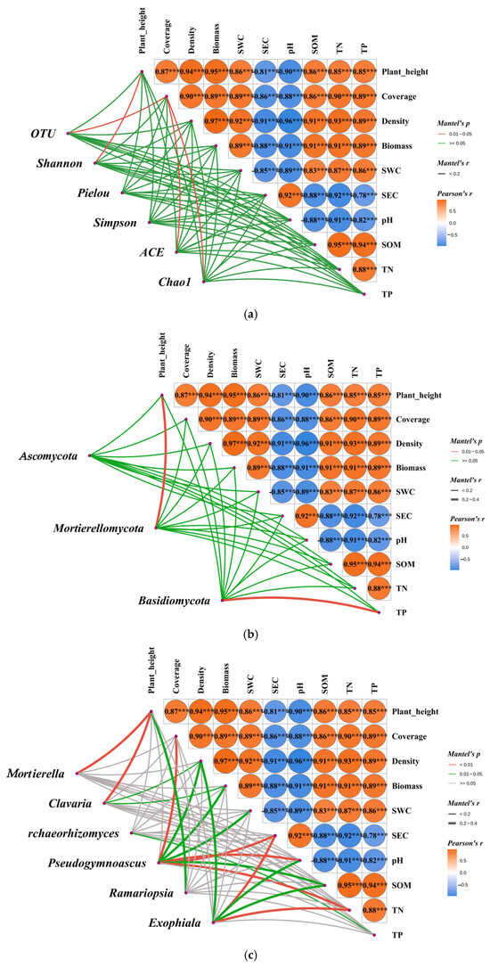 Furthermore, significant correlations exist between the aforementioned ten plant and soil indicators and the soil fungal community structure (α diversity, phylum-level abundance, and genus-level abundance) (Figure 12). At the α diversity level (Figure 12a), the number of soil fungal community OTUs exhibited a significant correlation with vegetation coverage (p < 0.05). The Shannon index exhibited a significant correlation with vegetation height (p < 0.05); both the Ace index and Chao1 index showed significant correlations with vegetation coverage (p < 0.05); while the Pielou index and Simpson index demonstrated no significant correlation with any of the 10 vegetation and soil indices. At the phylum level (Figure 12b), the abundance of Mortierellomycota was significantly correlated with vegetation height (p < 0.05). The abundance of Basidiomycota was significantly correlated with TP (p < 0.05). Ascomycota did not show any significant correlation with any soil physicochemical properties or plant community characteristics. At the genus level (Figure 12c), the abundance of Mortierella was highly significantly correlated with plant height (p < 0.01).The abundance of Clavaria was highly significantly correlated with plant height (p < 0.01) and significantly correlated with density and biomass (p < 0.05). The abundance of Archaeorhizomyces was significantly correlated with TP (p < 0.05). The abundance of Pseudogymnoascus was highly significantly correlated with coverage, SEC, pH, and TN (p < 0.01), and significantly correlated with density, biomass, soil water content (SWC), and SOM (p < 0.05). The abundance of Ramariopsia was significantly correlated with plant height (p < 0.05). The abundance of Exophiala was highly significantly correlated with SEC and TN (p < 0.01), and significantly correlated with density, pH, and SOM (p < 0.05).
