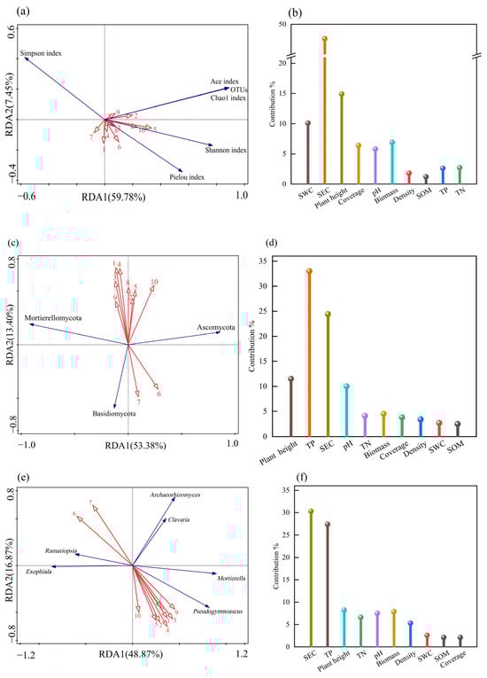RDA of plant community characteristics, soil physical and chemical properties, and soil fungal community structure. Note: red arrows indicate plant community characteristics and soil factors, and blue arrows indicate the fungal community structure. (a,b) α diversity; (c,d) bacterial phylum level; (e,f) bacterial genus level. 1: Plant height; 2: Coverage; 3: Density; 4: Biomass; 5: SWC; 6: SEC; 7: pH; 8: SOM; 9: TN; 10: TP.
