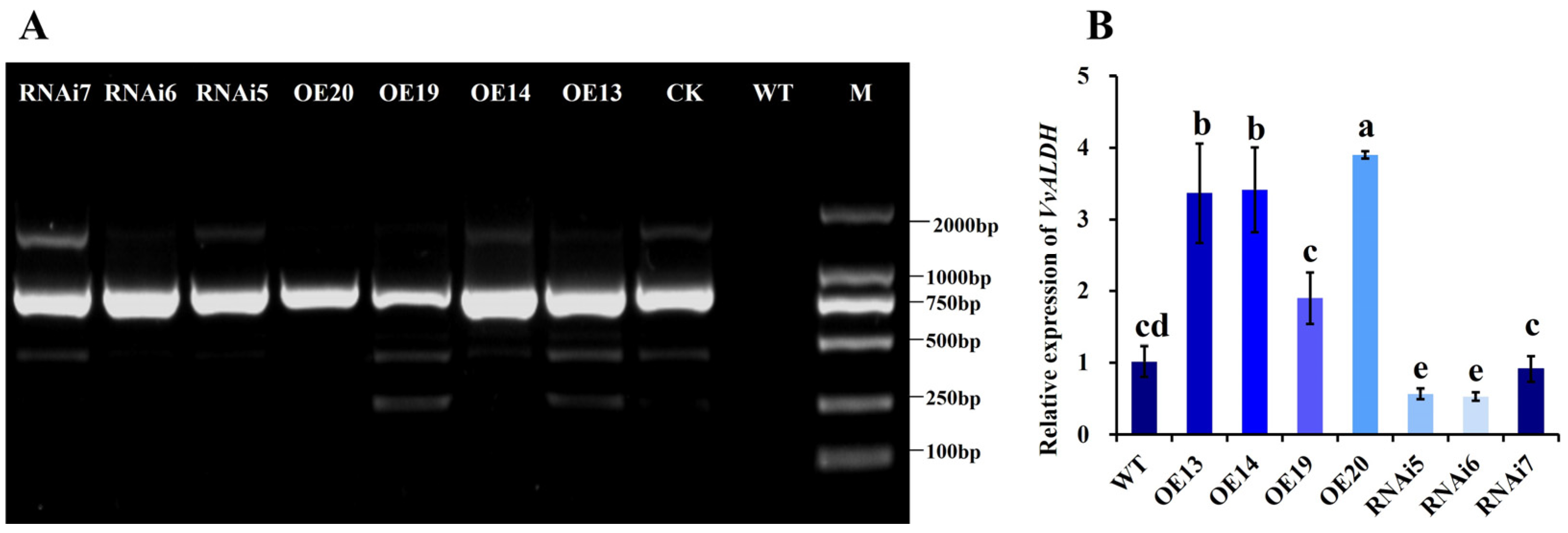 3.2.2. Quantitative Validation of VvALDH Overexpression and RNAi Transformants