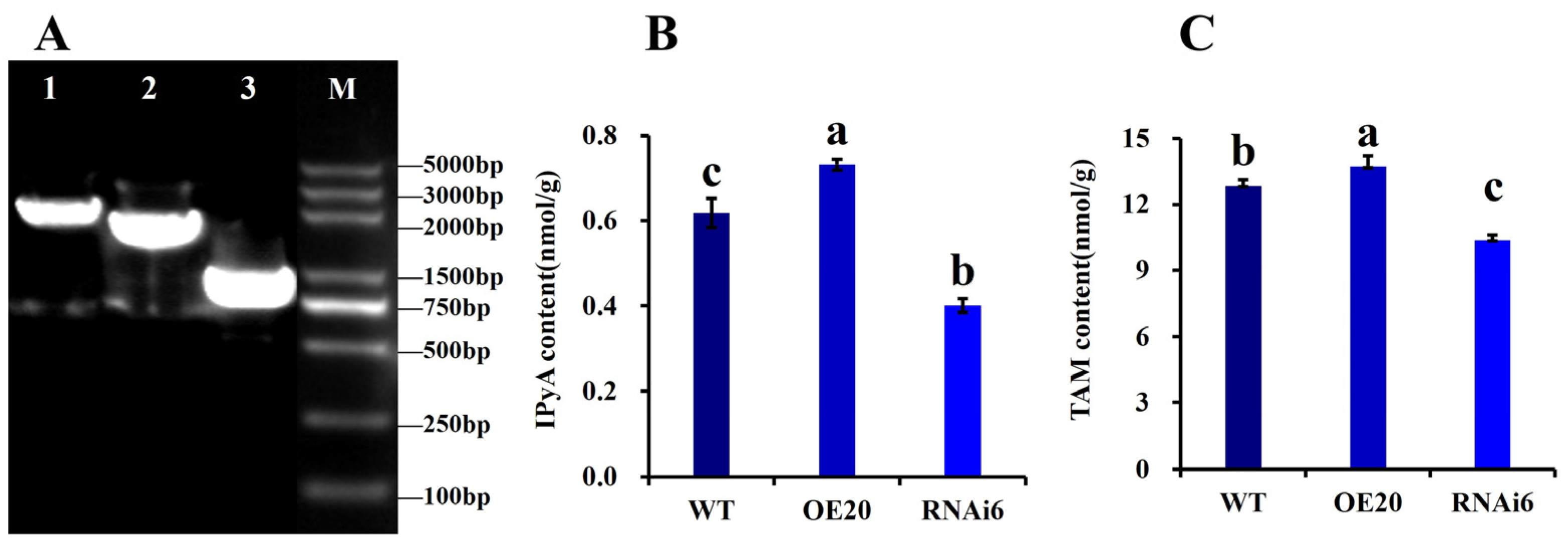 3.5. Detection of Key Genes in the IAA Synthesis Pathway of and Content of Intermediate Products in V. volvacea