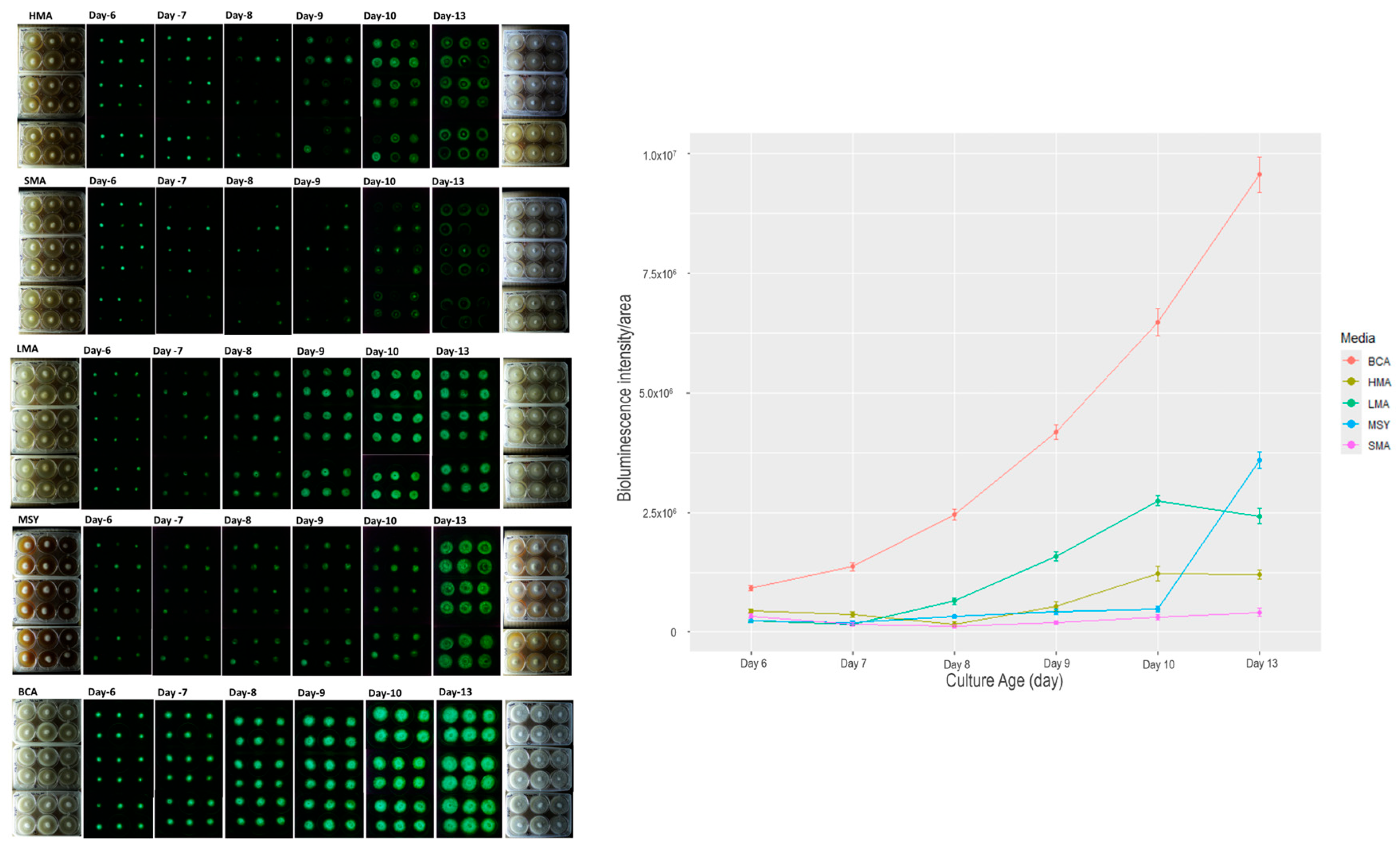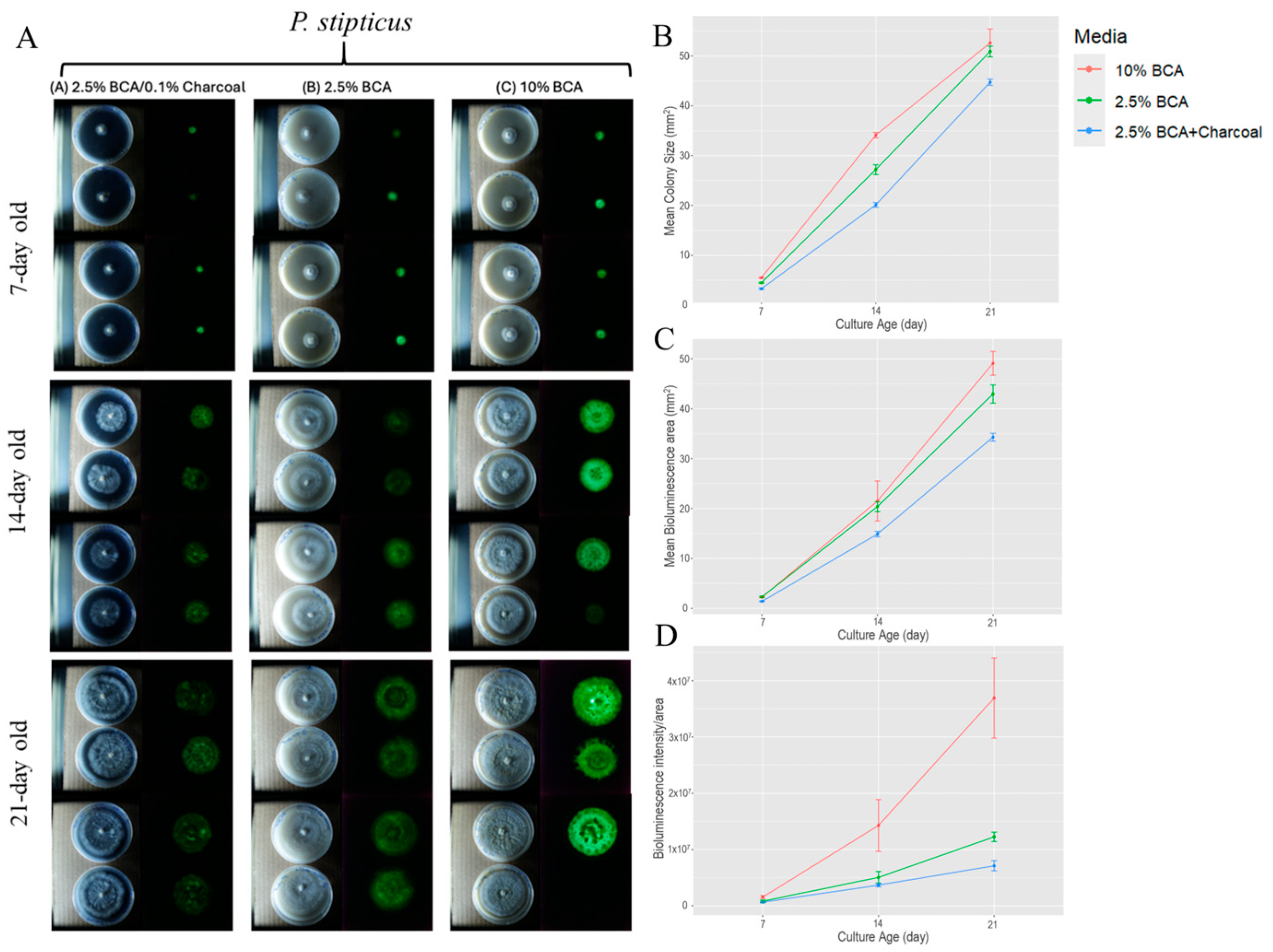 3.1. Effect of Culture Media on Bioluminescence and Colony Growth of P. stipticus