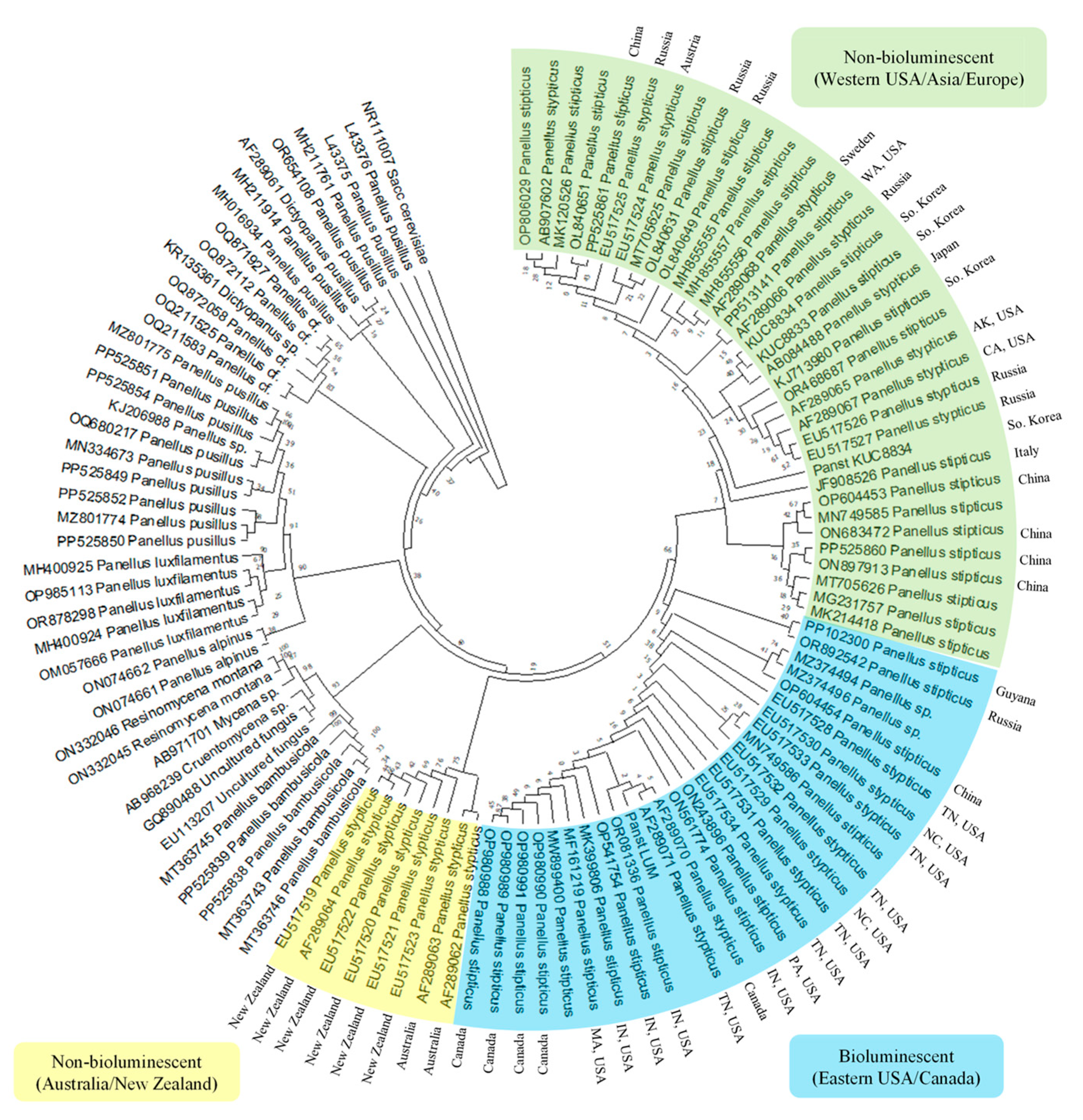 - Petersen, R.H.; Bermudes, D. Intercontinental Compatibility in Panellus stypticus with a Note on Bioluminescence. Persoonia—Mol. Phylogeny Evol. Fungi 1992, 14, 457–463. [Google Scholar]