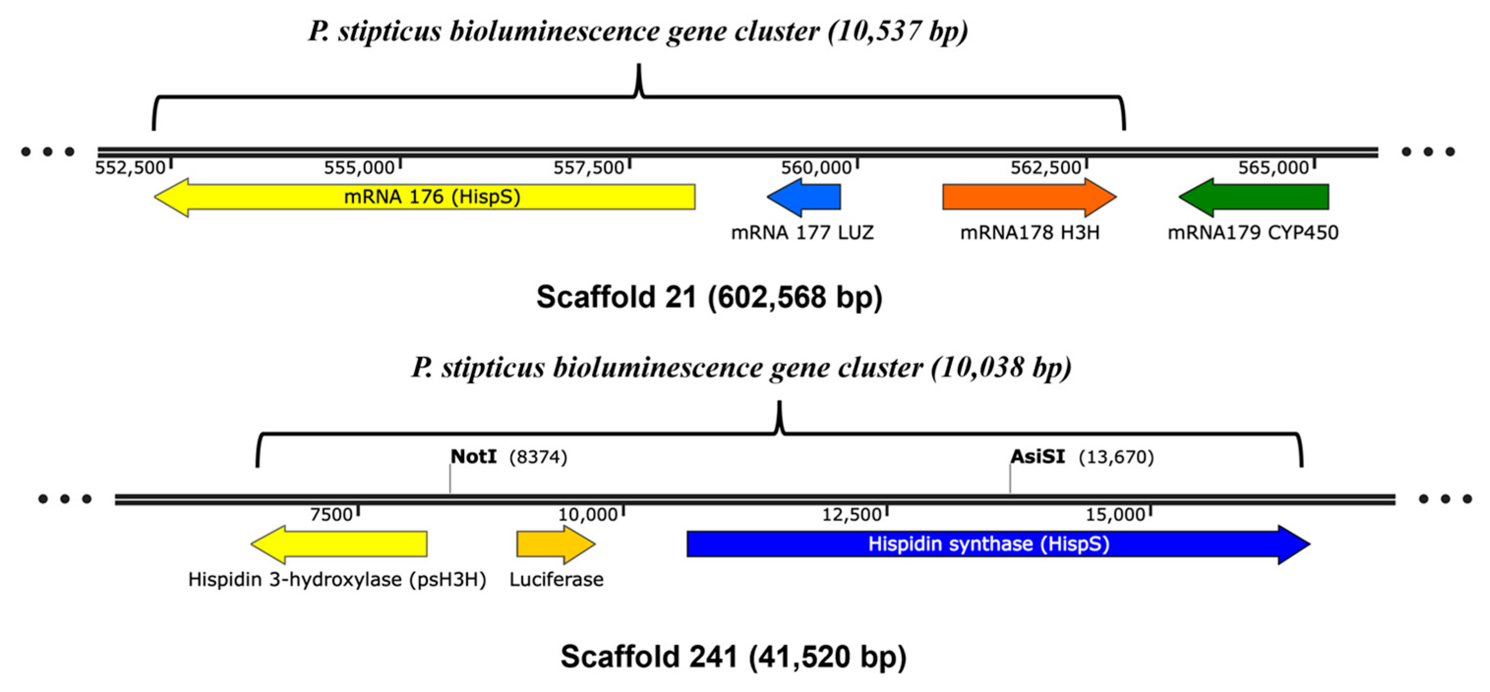 - Ke, H.-M.; Lee, H.-H.; Lin, C.-Y.I.; Liu, Y.-C.; Lu, M.R.; Hsieh, J.-W.A.; Chang, C.-C.; Wu, P.-H.; Lu, M.J.; Li, J.-Y.; et al. Mycena Genomes Resolve the Evolution of Fungal Bioluminescence. Proc. Natl. Acad. Sci. USA 2020, 117, 31267–31277. [Google Scholar] [CrossRef] [PubMed]