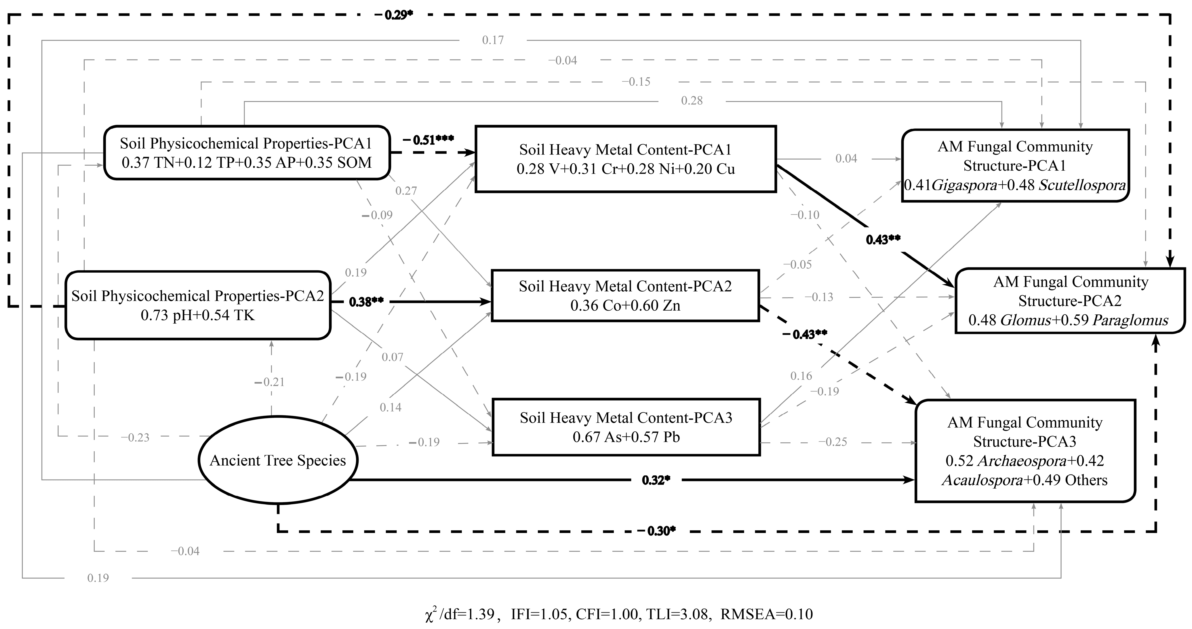 3.5. Structural Equation Modeling of AM Fungal Community Distribution and Soil Environmental Factors