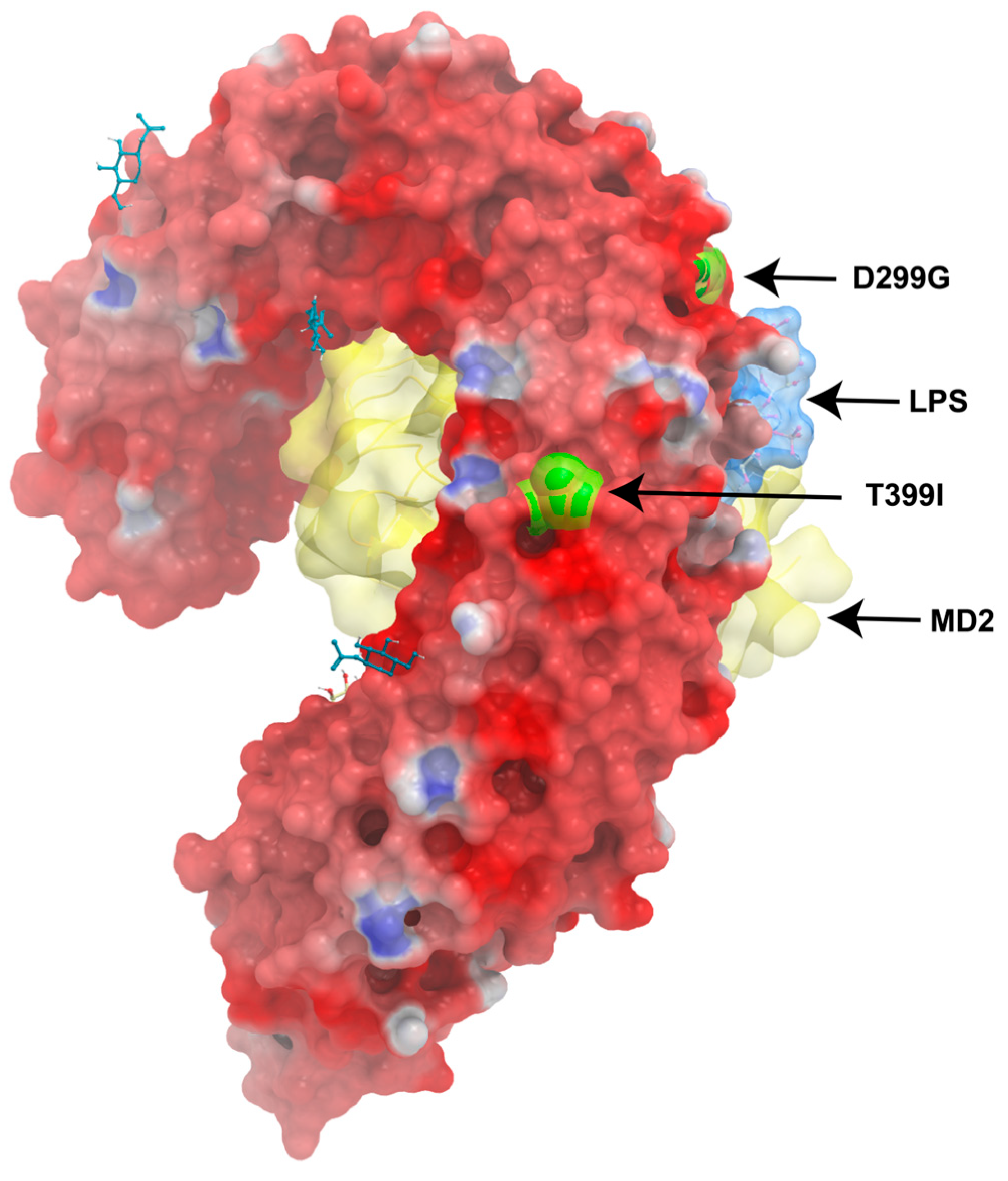 - Ohto, U.; Yamakawa, N.; Akashi-Takamura, S.; Miyake, K.; Shimizu, T. Structural analyses of human Toll-like receptor 4 polymorphisms D299G and T399I. J. Biol. Chem. 2012, 287, 40611–40617. [Google Scholar] [CrossRef] [PubMed]