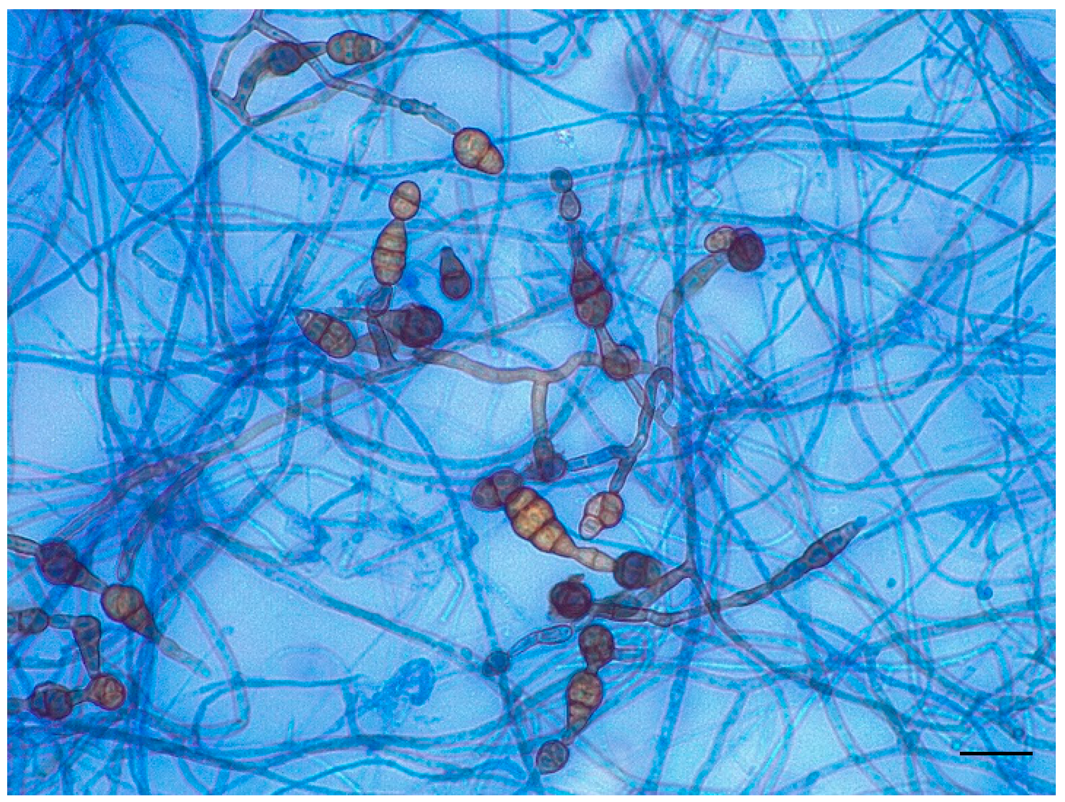 - de Hoog, G.S.; Horré, R. Molecular taxonomy of the Alternaria and Ulocladium species from humans and their identification in the routine laboratory. Mycoses 2002, 45, 259–276. [Google Scholar] [CrossRef]