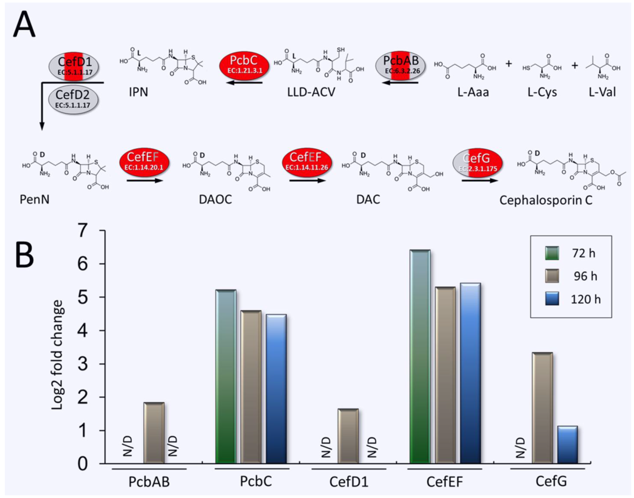 3.3. Upregulation of Enzymes of the CPC Biosynthesis Pathway in A. chrysogenum HY