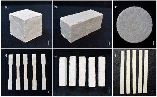 Test samples of MMBs were developed from Panus ciliatus (MFLUCC 25-0173) and sawdust: (a) Sample prepared for testing moisture content, dry density, volumetric shrinkage, compression strength, and water absorption. (b) Sample for flexural strength, SEM, TGA, chemical analyses (pH, organic matter, organic carbon, NPK), and soil burial degradability. (c) Sample for FTIR spectroscopy. (d) Sample for tensile strength and water contact angle. (e) Sample for impact strength. (f) Sample for flammability. Scale bars = 1 cm.