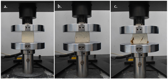 Flexural strength was conducted according to ASTM D790-10, following the procedure described by Appels et al. [48], using a Universal Testing Machine (UTM; Instron and Model 5566) (Figure 3). The test was performed with a crosshead speed of 2 mm min−1 and a clamp support span of 100 mm. Each strain was tested in five replications. Flexural strength was expressed in kilopascals (kPa) and calculated from the load–displacement data using the formulas: flexural stress (σf) = 3FL/(2bd2), where F = applied load at fracture (N), L = support span (m), b = specimen width (m), and d = specimen thickness (m).