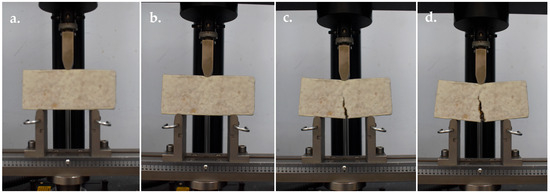 Flexural strength test of MMB developed from Panus ciliatus (MFLUCC 25-0173) and sawdust. (a) Sample before testing. (b) Bending under load. (c) Initial crack formation. (d) Complete crack.