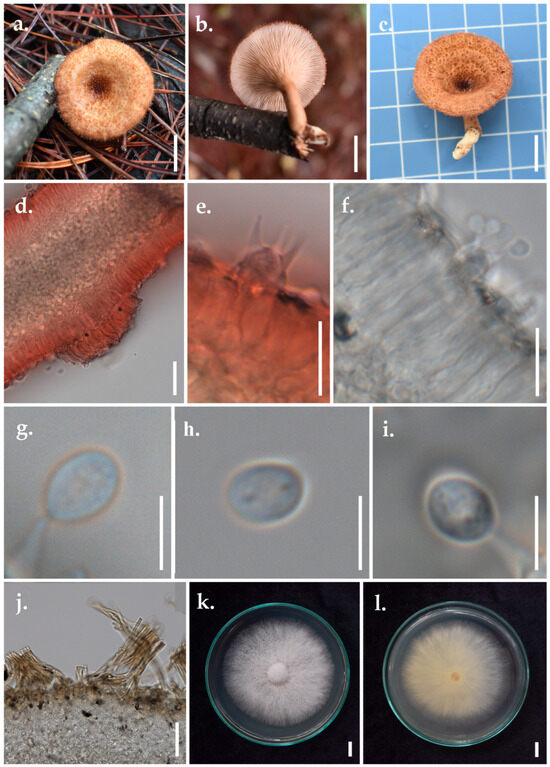 Macro-morphological characters were examined both in the field and the laboratory. Fresh specimens were photographed in the field using a Nikon (Tokyo, Japan) SLR D3400 camera. Morphological descriptions followed the methods of Lodge et al. [24], and colour codes and terms were noted according to the Methuen Handbook of Colour [25]. Micro-morphological characters (basidia, basidiospores, cystidia, pileipellis, and hyphae) were observed using OLYMPUS (Tokyo, Japan) BX-53 and Nikon (Tokyo, Japan) Eclipse Ni compound microscopes. Freehand sections of dried specimens were treated with 5% KOH and then mounted in 1% Congo red. Additional sections were mounted in distilled water and/or 5% KOH to determine the presence of pigments or any colour reactions. Basidium length was measured excluding sterigmata. Thirty basidiospores were measured in side view to determine size ranges. The size and shape of basidiospores were expressed by the following Q = L/W ratio: L = mean length, W = mean width. Photomicrographs were taken with a camera attached to the compound microscope, and all microscopic measurements were taken using the Tarosoft® (Bangkok, Thailand) Image Framework program v.0.9.7. Dried specimens were deposited in the Fungarium of Mae Fah Luang University (MFLU), and the pure cultures were deposited in the Mae Fah Luang University Culture Collection (MFLUCC).