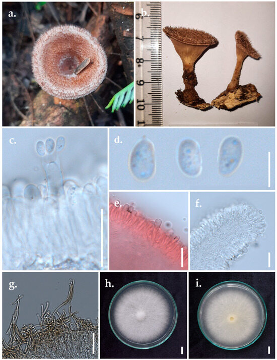 Panus Fr. (Panaceae, Polyporales) was described by Fries [1], with P. conchatus (Bull.) Fr. as the type species. Members of this genus are wood-inhabiting saprobes distributed worldwide, particularly in subtropical and tropical regions [2,3]. Panus species are characterised by a centrally to eccentrically stipitate basidiomata; infundibuliform to cyathiform pilei; a hymenophore with decurrent lamellae, free gills; ellipsoid, smooth, thin-walled, inamyloid basidiospores; thin to thick-walled cystidia; and a dimitic hyphal system with unbranched skeletal hyphae [1,3,4].
