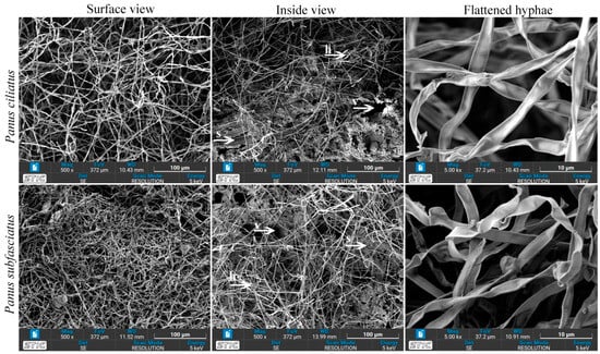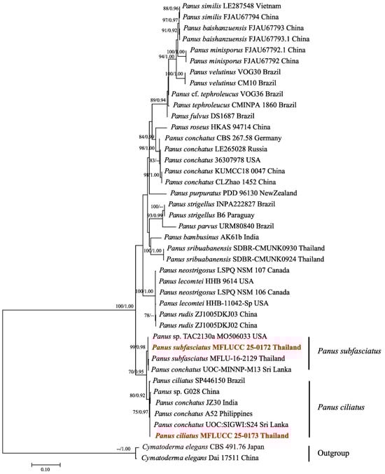 Fresh specimens of Panus ciliatus and P. subfasciatus were collected from decaying logs in a mixed deciduous forest in Chiang Rai Province, Thailand. Macro-morphological characters were recorded from the fresh specimens, which were then air-dried at 55 °C for 48 h until completely dehydrated [21]. The dried specimens were kept in paper bags, stored at room temperature, and subsequently used for micro-morphological characterisation. Fresh specimens were also used for tissue isolation on potato dextrose agar (PDA) plates, which were incubated at 25 °C in the dark. After 3–5 days of growth, cultures were sub-cultured onto a fresh PDA plate to obtain pure isolates. These pure cultures were maintained at 4 °C for further studies.