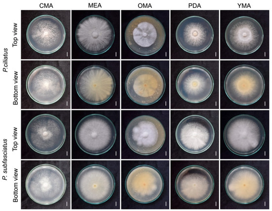 Five agar-based media were tested: corn meal agar (CMA), malt extract agar (MEA), oatmeal agar (OMA), potato dextrose agar (PDA), and yeast malt agar (YMA). All equipment and media were sterilised at 15 psi for 20 min at 121 °C. Mycelial plugs (5 mm diameter) were taken from the actively growing edge of 10-day-old PDA cultures and inoculated onto the test media. Plates were incubated at 25 °C in the dark for 12 days. The mycelium growth rate was recorded daily using the method described by Luangharn et al. [42]. The mycelium density was scored as very scanty (1+), scanty (2+), moderate (3+), somewhat abundant (4+), or abundant (5+) [42]. The growth rate and density measurements were performed in five replicates.