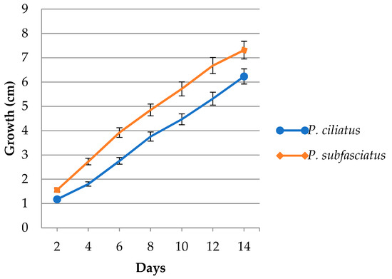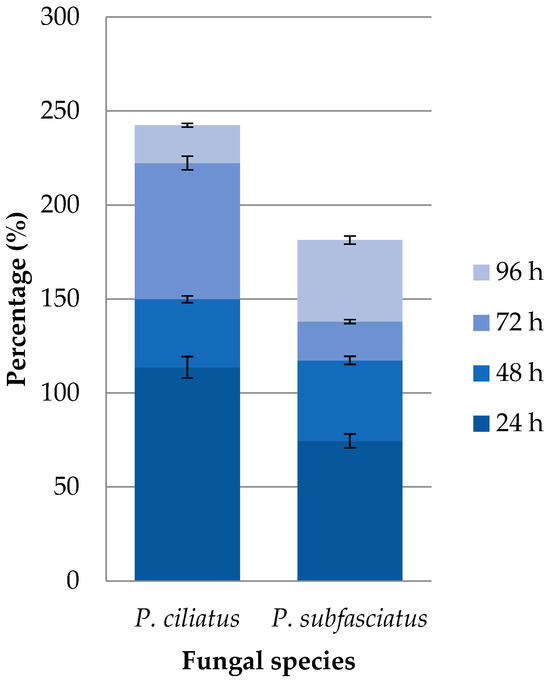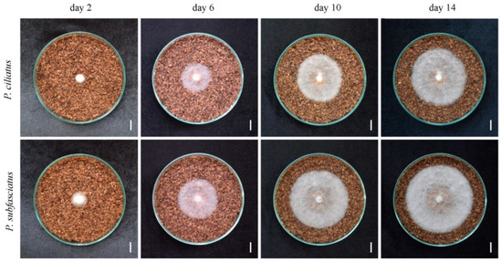 Rubber sawdust (≤2 mm particle size) was soaked in tap water overnight and subsequently drained to remove excess moisture. The sawdust was used as the primary substrate (80% w/w), supplemented with 10% rice bran, 4% yeast extract, 4% molasses, 1.5% calcium carbonate (CaCO3), and 0.5% gypsum (CaSO4 · 2H2O). A 30 g portion of the prepared substrate mixture was transferred into glass plates, packed in a polypropylene bag, and sterilised at 121 °C for 60 min. After cooling, 5 mm mycelial plugs from 10-day-old cultures of Panus ciliatus and P. subfasciatus were inoculated at the centre of each plate, and incubated in the dark at 25 °C. Each treatment was performed in five replicates. Mycelial growth diameter was measured every two days, beginning on day 2 post-inoculation, until complete colonisation of the substrate was observed. Mycelial density was recorded on day 14.