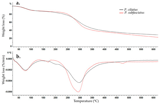 Among several orders of Basidiomycota, members of the order Polyporales are highly prioritised due to their inherent ability to produce superior-quality MMBs [20,21]. Panus, like many other mushroom genera, remains underexplored in the context of MMB development. Interestingly, this genus meets the recommended fungal criteria for developing MMBs as reported by Sydor et al. [22], including a saprobic nature, white-rot decay, rapid hyphal growth, a dimitic hyphal system, and non-toxicity. Additionally, Hibbett et al. [23] demonstrated that Panus mycelia grow effectively on sawdust at room temperature and a moisture content of 65%. In this study, wild strains of Panus ciliatus and P. subfasciatus collected from forests of Chiang Rai Province, Thailand, were identified through a combination of morphological and molecular phylogenetic analyses (ITS region). Subsequently, Panus ciliatus is reported as a new geographical record from Thailand. The pure mycelium from these species was used to develop MMBs, which were subsequently evaluated for their physical (moisture content, density, shrinkage), mechanical (compression, flexural, tensile, and impact strengths), hydrodynamic (water absorption, water contact angle), and chemical (pH, electrical conductivity, organic matter, organic carbon, nitrogen, phosphorus, and potassium contents) properties. This is the first report of MMBs produced from these fungi. Additional evaluations included Fourier-transform infrared (FTIR) spectroscopy, thermogravimetric analysis (TGA), flammability, soil burial degradability, and maintenance of mycelial viability. Additionally, MMB prototypic products were successfully developed, demonstrating their potential in the valorization of lignocellulosic wastes and applications in packaging, construction, insulation, and indoor uses.