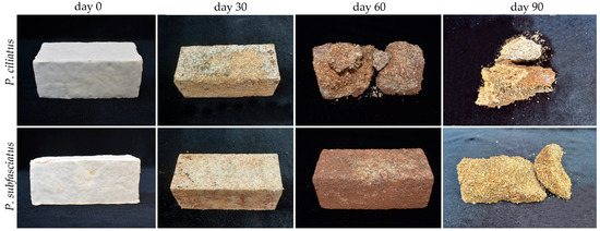 Fully colonised MMB cubes (5 × 5 × 5 cm) were used to calculate volumetric shrinkage following the method described by Elsacker et al. [47]. Shrinkage percentage was calculated as: shrinkage (%) = (V1 − V2)/V1 × 100, where V1 = moist volume of sample and V2 = dry volume of sample. The test was conducted in five replicates.