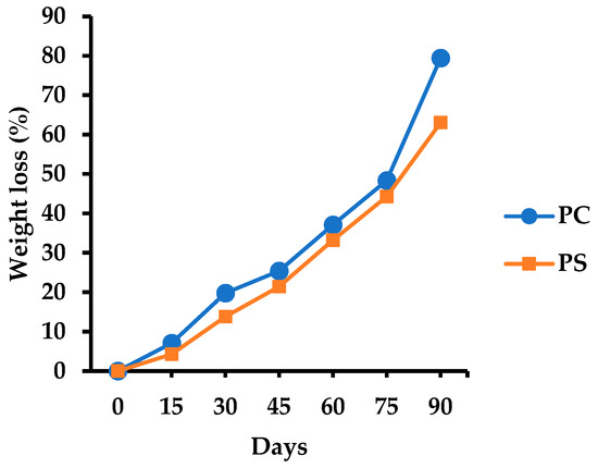 Compression strength was measured according to the American Society for Testing and Materials (ASTM) D3501-94, following the procedure described by Elsacker et al. [47], using a Universal Testing Machine (UTM; Instron Model 5566, Instron Corporation, Norwood, MA, USA) (Figure 2). The test was conducted with a 10 kN capacity load bench and a 10 kN load cell, operated under ambient conditions at 25 °C, with ⁓50% relative humidity. Tests were performed under displacement control at a rate of 5 mm min−1, with five replicates per sample. Compression strength was expressed in kilopascals (kPa) and calculated from the load–displacement data using the following formulas: compressive stress (σ) = F/A and strain (ɛ) = (∆L/Lo), where F = compressive force (N), A = original cross-sectional area (m2), ΔL = displacement of the loading surfaces (m), and Lo = original height of the specimen (m).