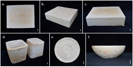 - Elsacker, E.; Vandelook, S.; Brancart, J.; Peeters, E.; De Laet, L. Mechanical, physical and chemical characterisation of mycelium-based composites with different types of lignocellulosic substrates. PLoS ONE 2019, 14, e0213954. [Google Scholar] [CrossRef]