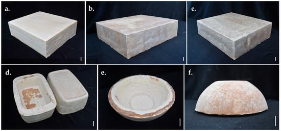 For the compression strength test, moulds were designed from acrylic transparent sheets that were cut into a cubic shape (5 × 5 × 5 cm), following the method by Özdemir et al. [44]. The moulds for the tensile and impact tests were designed into a dumbbell-shaped segment (165 × 19 mm, neck 57 × 13 mm) and a cuboid shape (63.5 × 12.7 × 12.7 mm), respectively, following American Society for Testing and Materials (ASTM) standards [45]. For the flexural strength test, the moulds were prepared into a cuboid shape (12 × 5 × 5 cm). Glass Petri-dishes (diam. 9 cm) were used to prepare circular samples for FTIR spectroscopy.