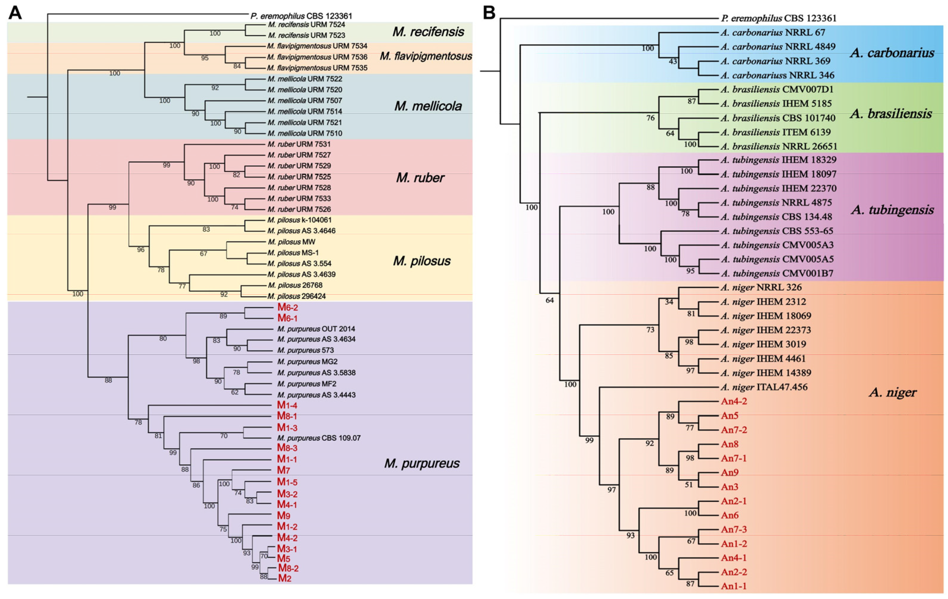 - Bian, C.; Kusuya, Y.; Sklenář, F.; D’hooge, E.; Yaguchi, T.; Ban, S.; Visagie, C.M.; Houbraken, J.; Takahashi, H.; Hubka, V. Reducing the number of accepted species in Aspergillus series. Nigri. Stud. Mycol. 2022, 102, 95–132. [Google Scholar] [CrossRef]