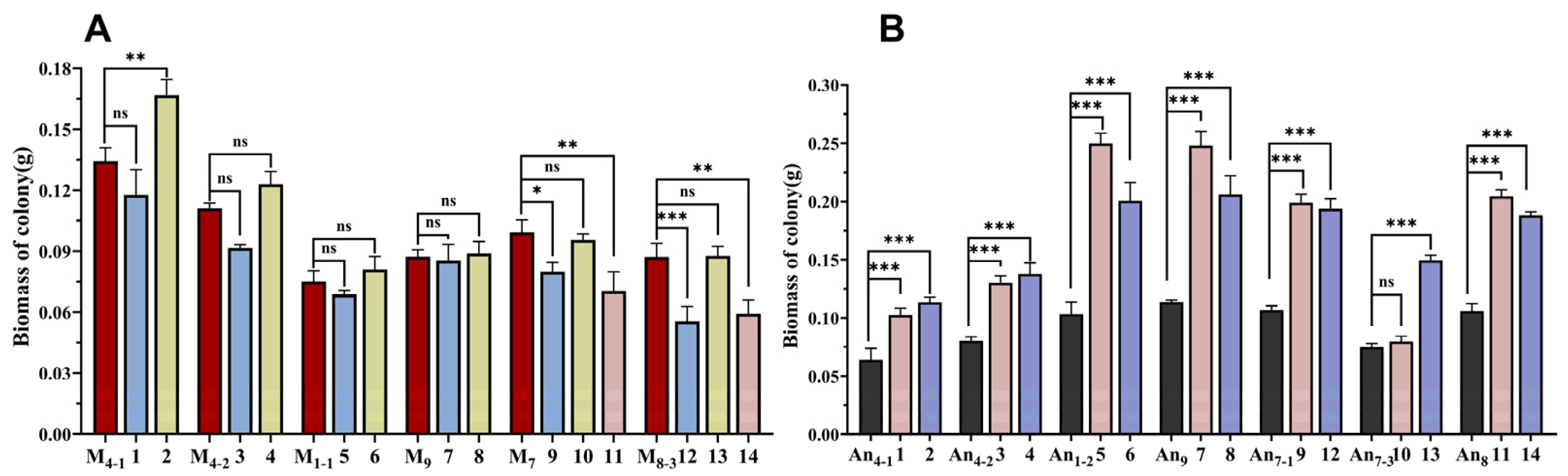 3.2. Morphological Properties and Biomass in Co-Culture of M. purpureus and A. niger