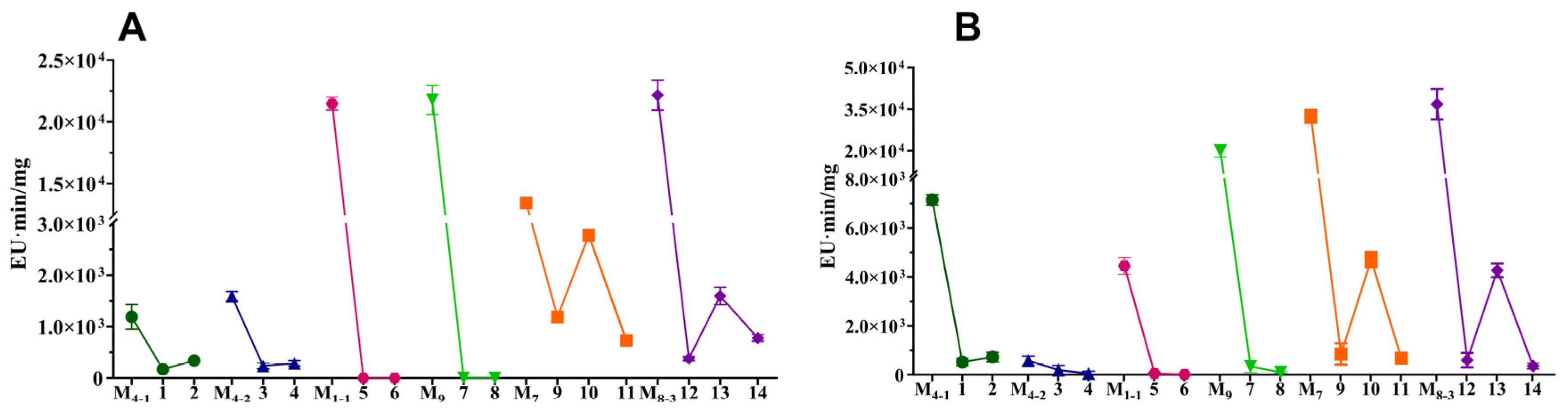 - Zheng, C. Isolation of High-Yield Esterase and Non-Citrinin Monascus Strain and Its Esterase Production Condition Optimation. Master’s Thesis, Huazhong Agricultural University, Wuhan, China, 2017. (In Chinese). [Google Scholar]